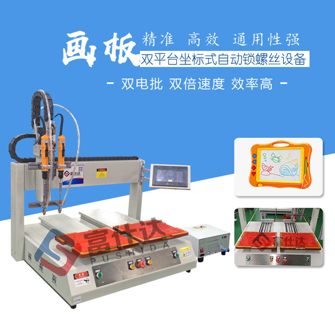 兒童畫(huà)板自動(dòng)鎖螺絲機(jī)采用富仕達(dá)雙平臺(tái)坐標(biāo)式,配置2把電批一次同時(shí)擰好2顆螺絲,效率提升2倍,設(shè)計(jì)可調(diào)式夾具,滿(mǎn)足多產(chǎn)品生產(chǎn)要求。
