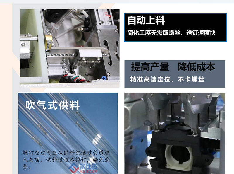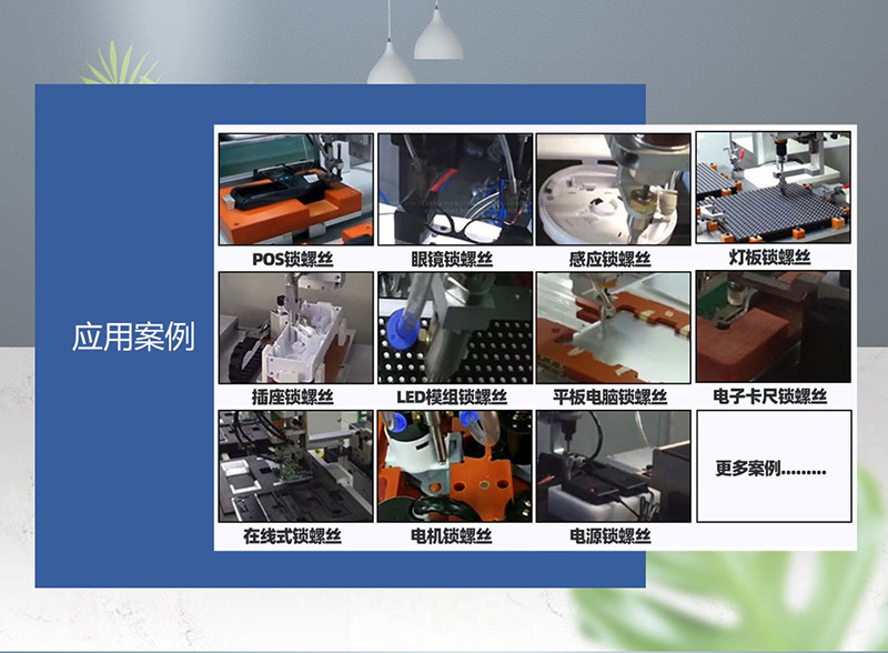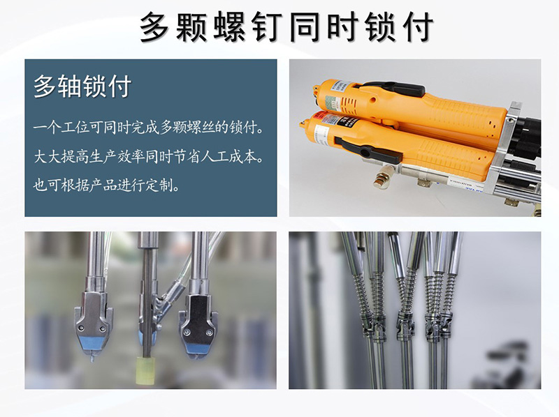 設(shè)備主要由自動(dòng)送釘機(jī)、多軸鎖付系統(tǒng)、多工位作業(yè)臺(tái)、機(jī)械手臂等機(jī)構(gòu)組成,根據(jù)產(chǎn)品螺絲數(shù)量定制多軸鎖付系統(tǒng)及自動(dòng)送釘數(shù)量,達(dá)到一次輸送并擰好所有螺絲的效果,大幅提升效率,簡(jiǎn)化工序。